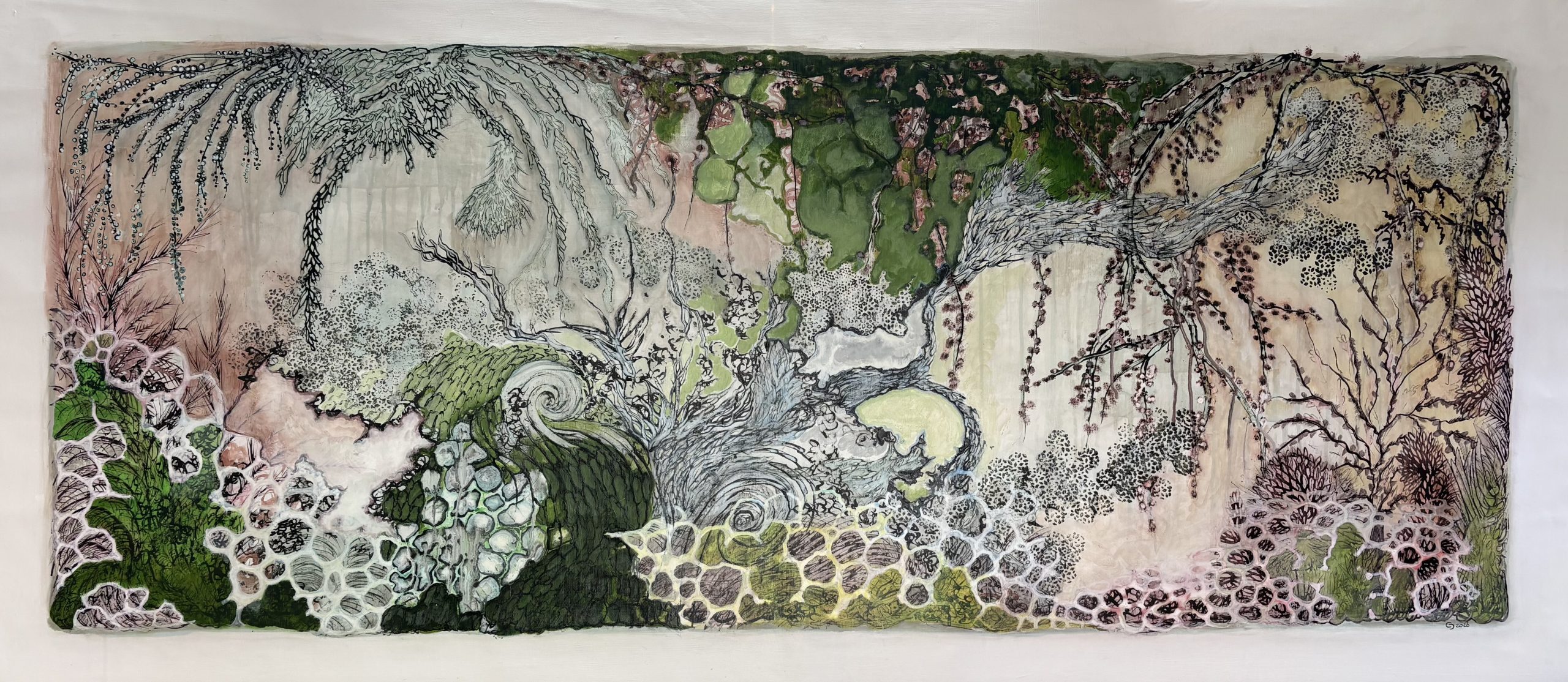Mixed media met zeefdruk op banner – 61,5×36,5 cm 2025